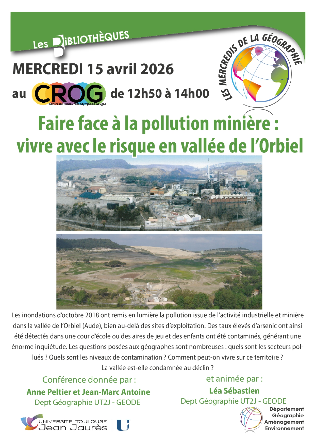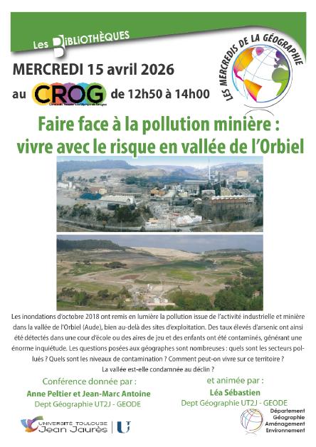 Conférence de Anne PELTIER (Maîtresse de Conférences) et Jean-Marc ANTOINE (Professeur des Universités) membres du GEODE dans le cadre des "Mercredis de la Géographie" : Faire face à la pollution minière : vivre avec le risque en vallée d'Orbiel"