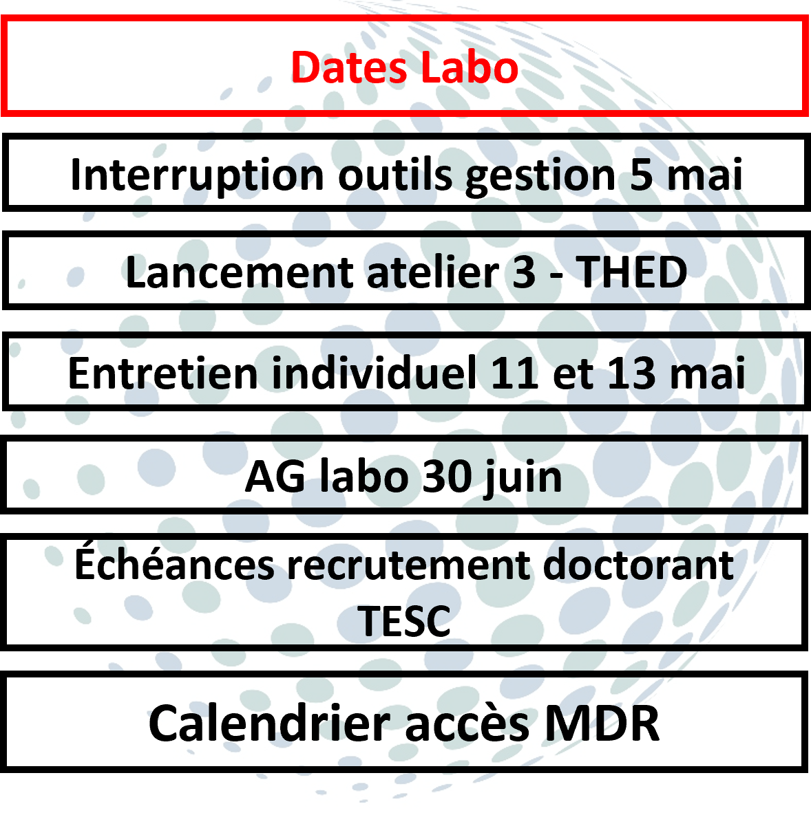 AG labo / Réu THED / Calendrier accès MDR / Échéances TESC...