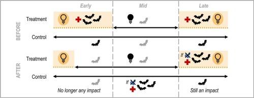 We took advantage of the modification of an existing PNL during a month-long event, consisting in switching off lights two hours earlier than the rest of the year. By carrying out an acoustic monitoring of bat echolocation calls, using a Before-After Control-Impact Paired protocol, we showed that bats were attracted to lit sites, especially at the beginning and end of the night.